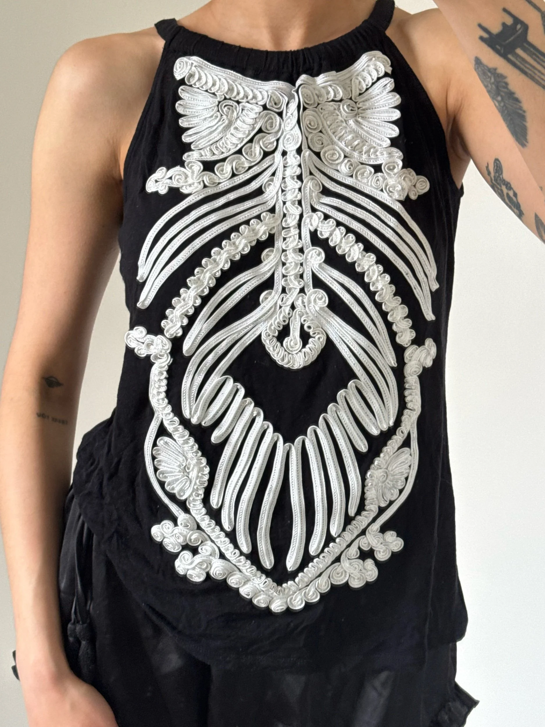 Featuring a symmetrical embroidered appliqué design on the front in white