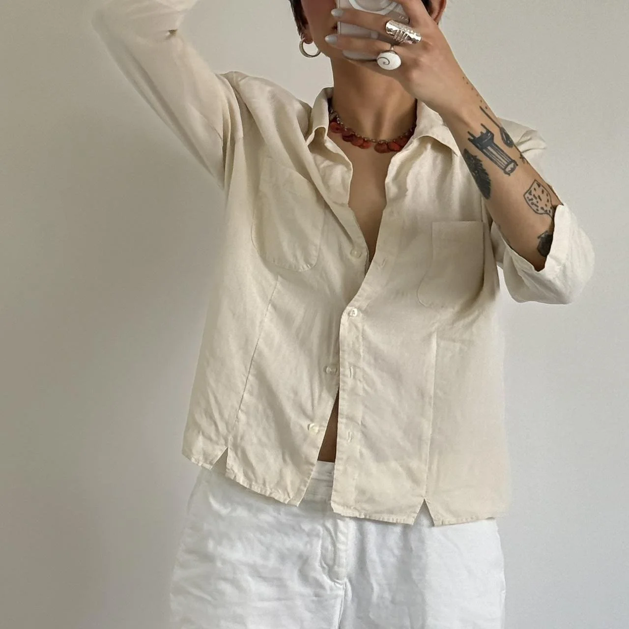 A 3/4 sleeve light weight cropped shirt in off white