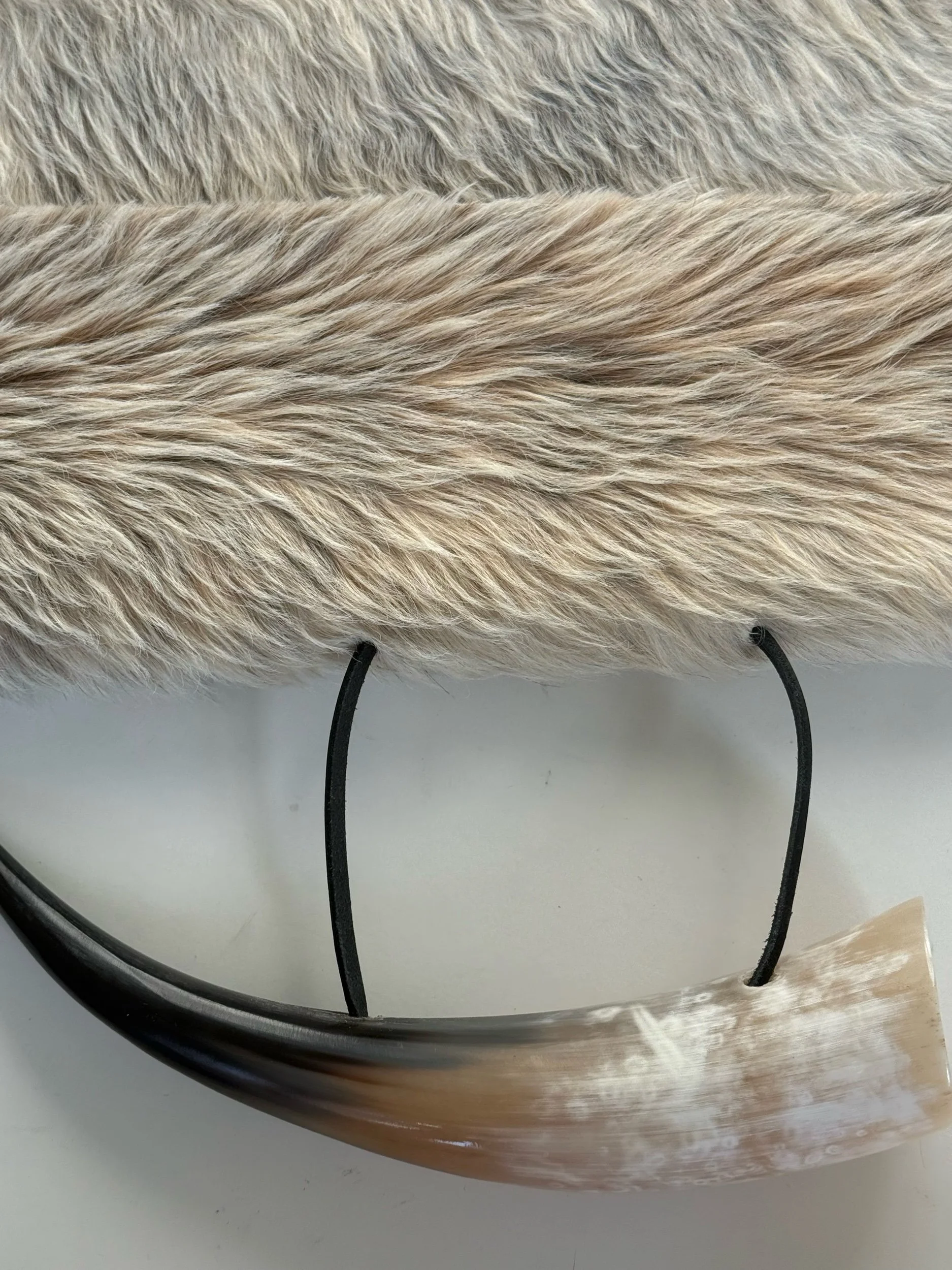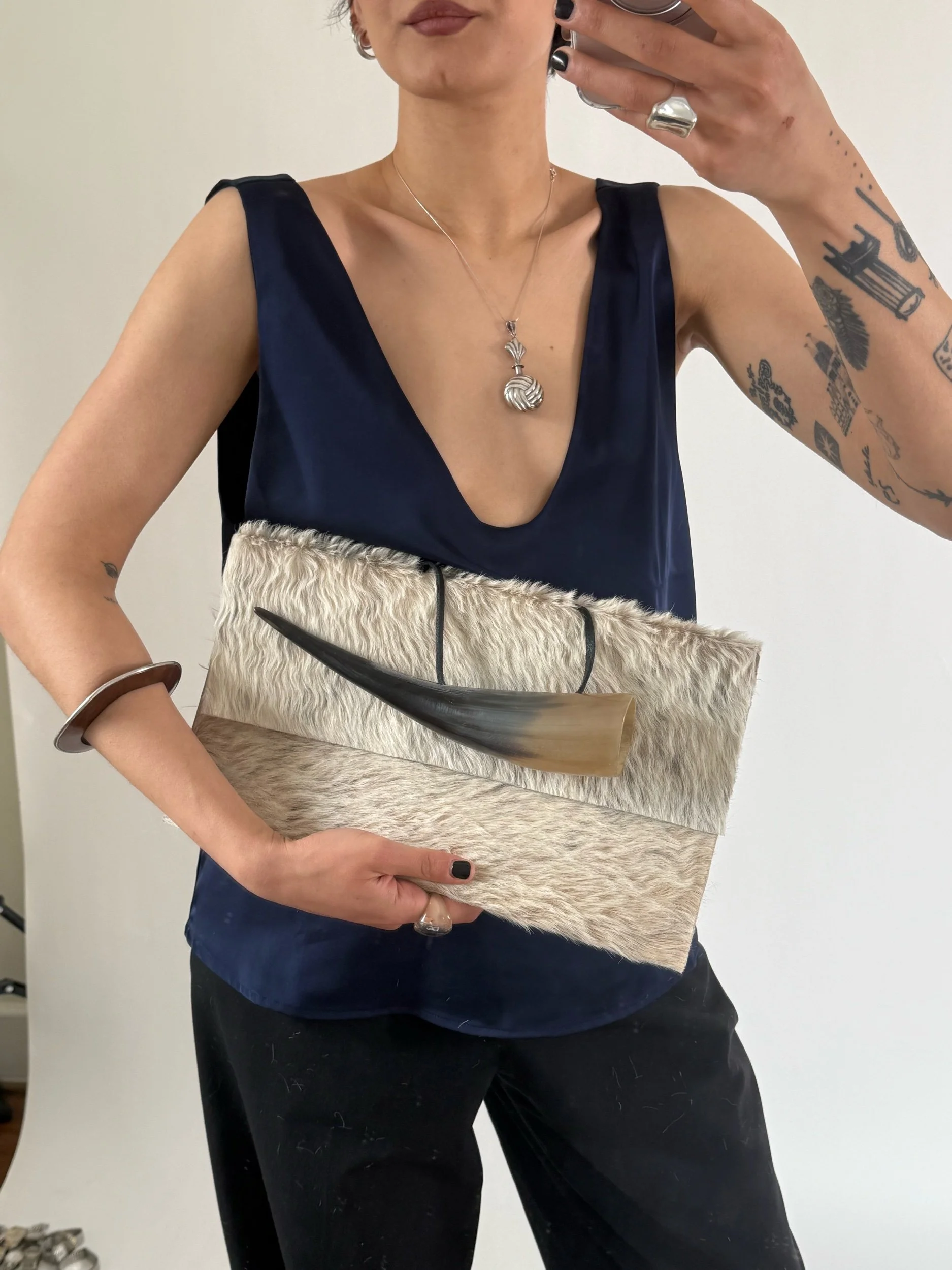 featuring a sculptural natural horn handle and silver snap closures